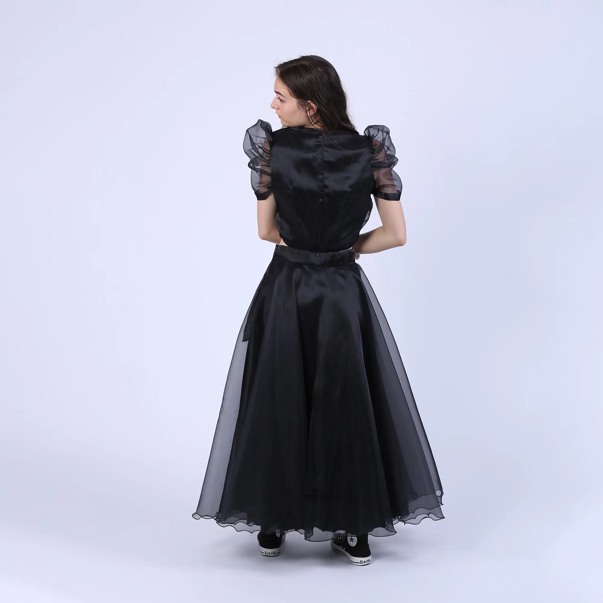 Bluza scurta, pana in talie, petrecuta, maneci scurte bufante din organza neagra.