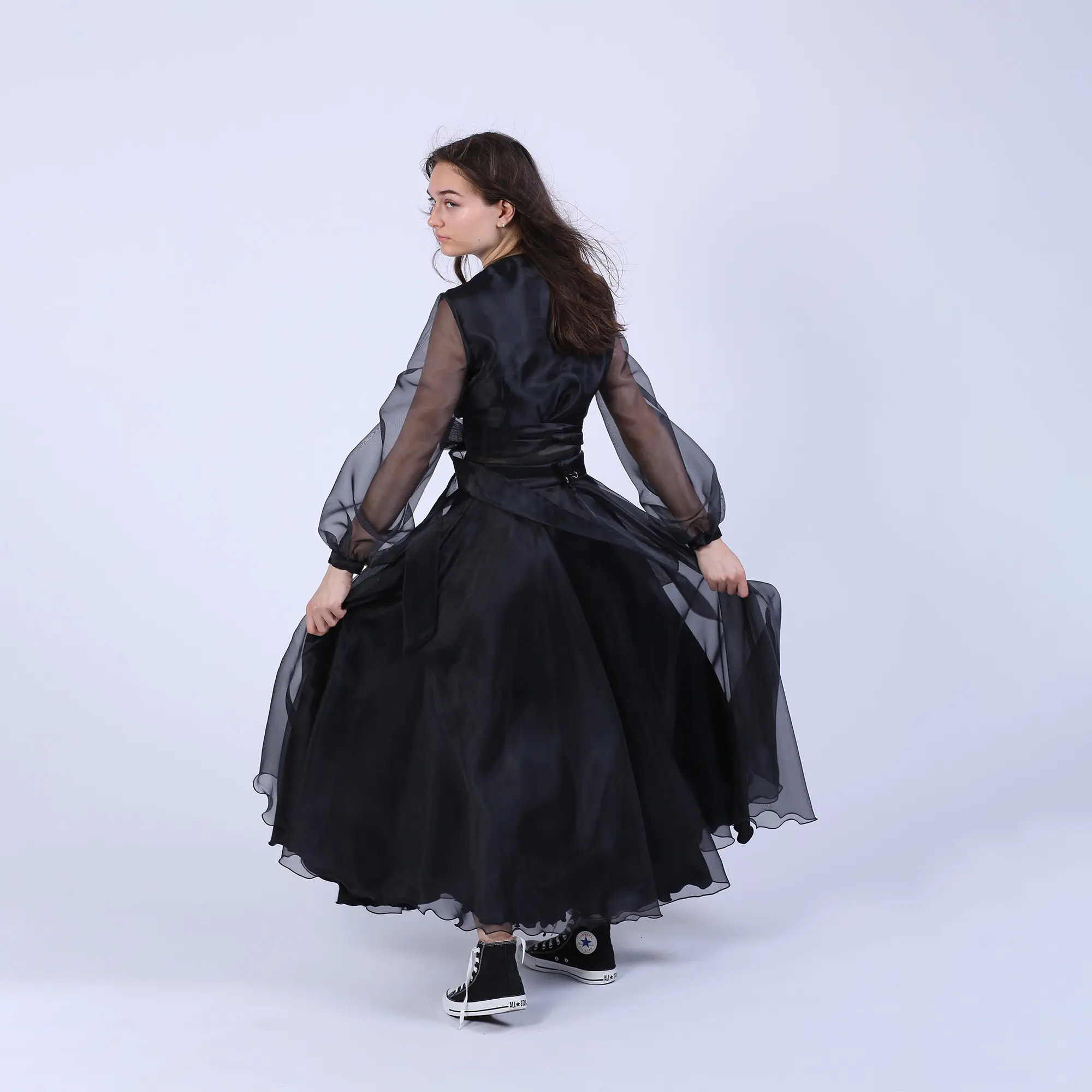 Bluza scurta pana in talie, petrecuta si cu maneci bufante din organza neagra. Bluza se prinde cu doua cordoane lungi si este captusita. O piesa usor de purtat atat cu pantaloni cat si cu fuste.
