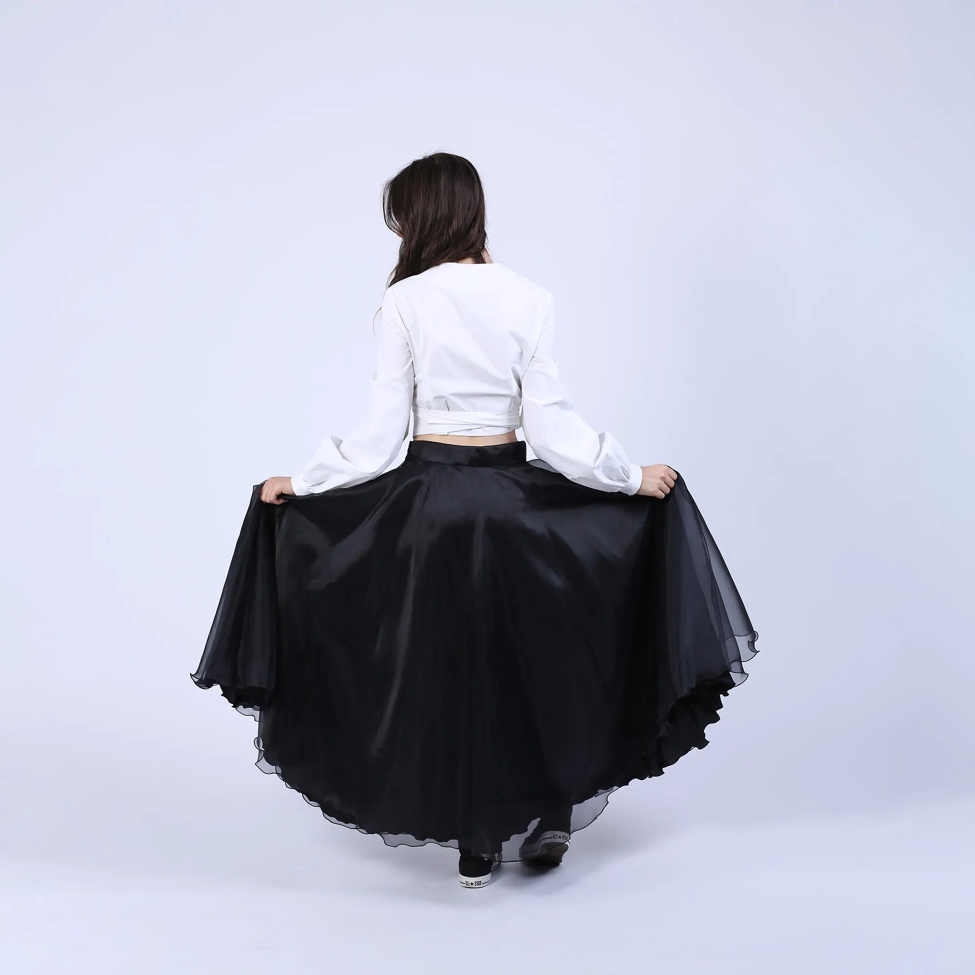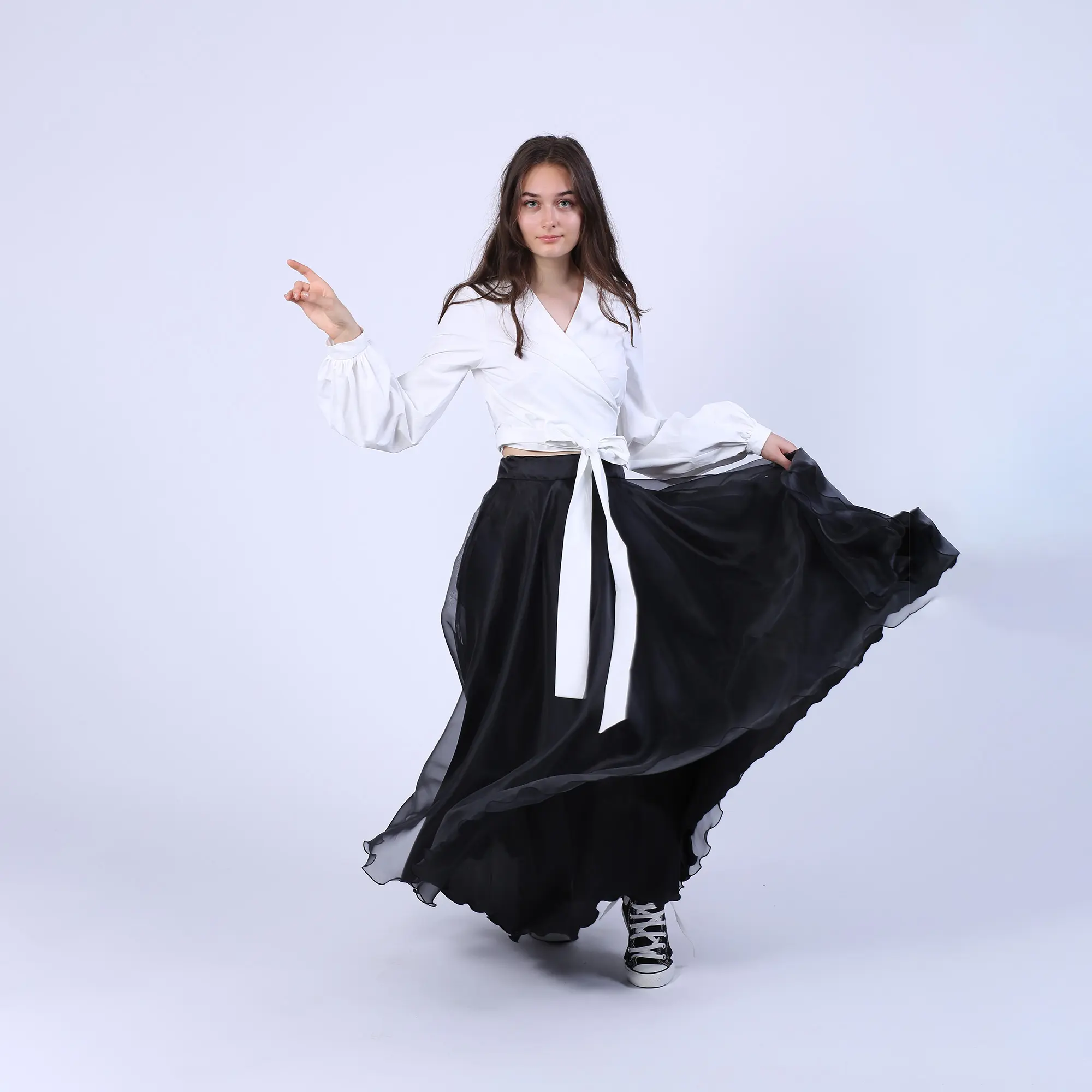 Bluza scurta, pana in talie, petrecuta cu doua cordoane foarte lungi. Bluza are maneci bufante si este din bumbac alb.