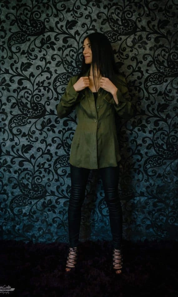 Camasa din matase naturala kaki, rotunjita la poale. Tesatura: 100% matase.
