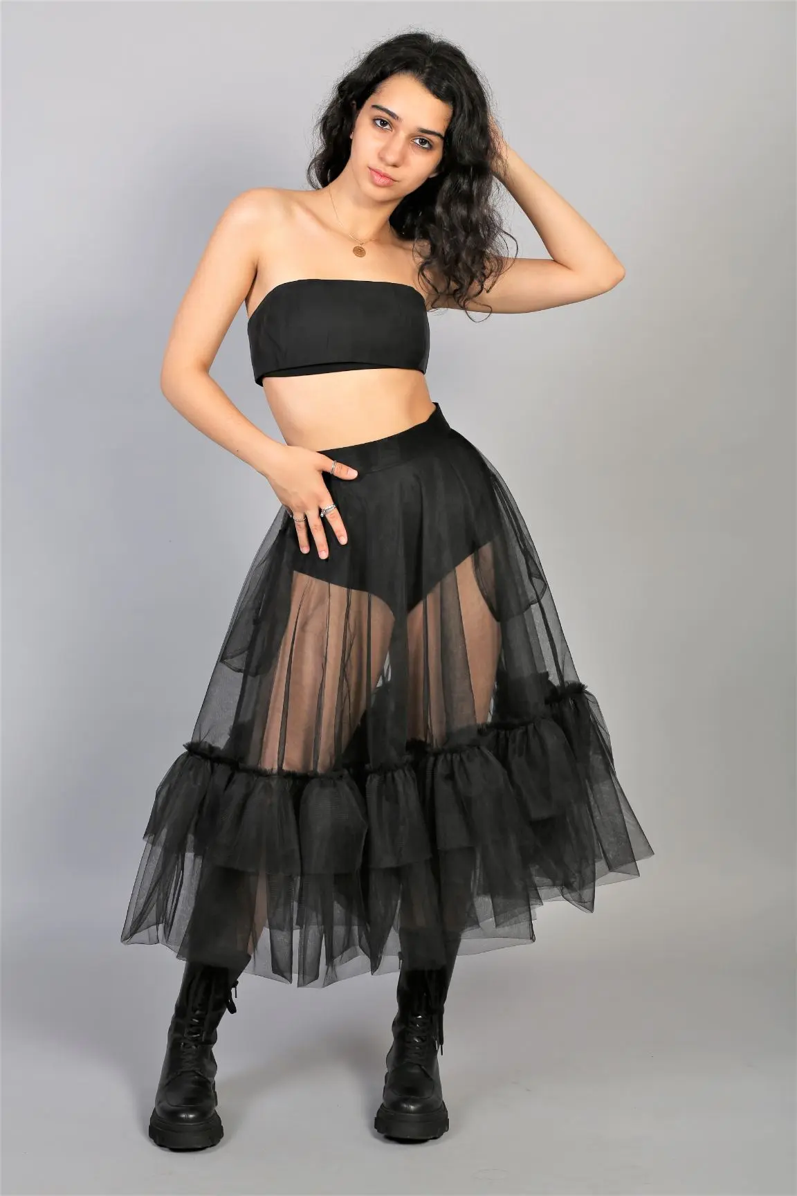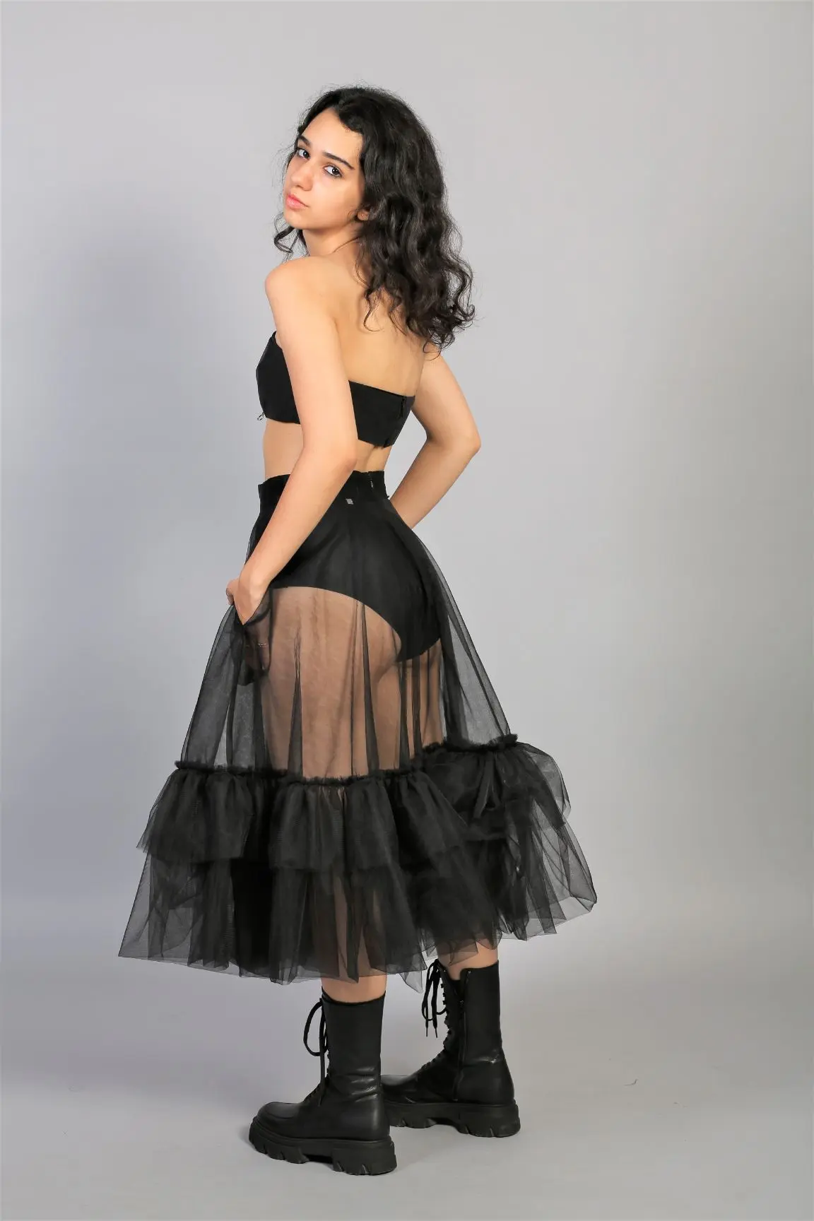 Fusta clos, transparenta, cu volane la poale din tulle negru, cu buzunare laterale si inchisa lateral cu fermoar ascuns. Tesatura si volanele o fac irezistibila, un must-have in garderoba ta.