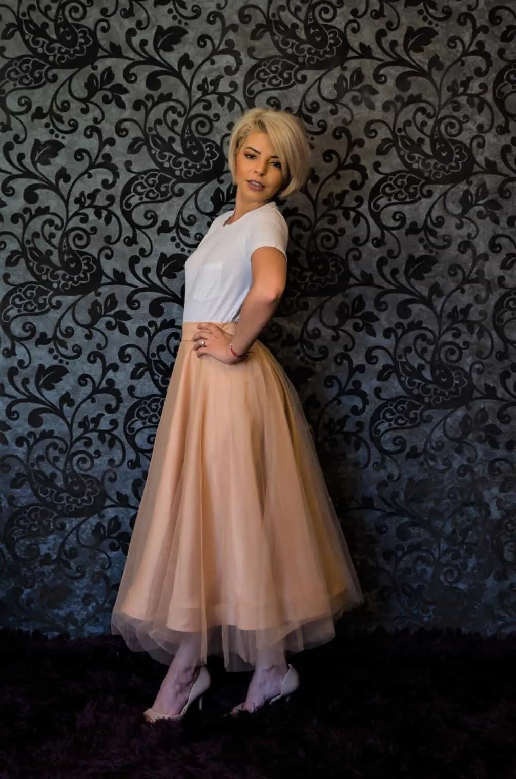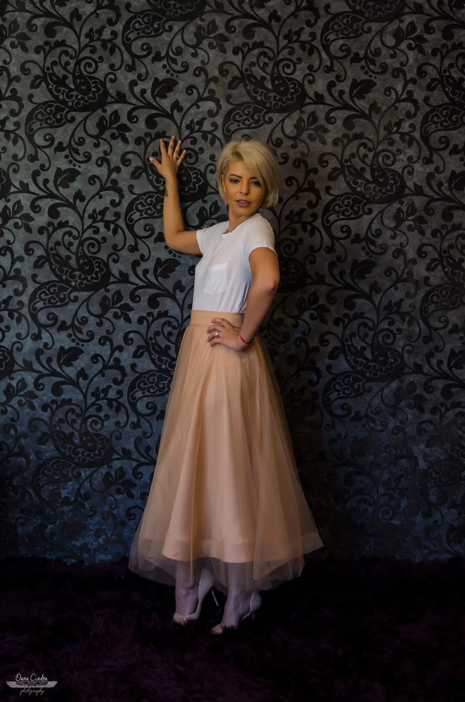 Fusta clos dublu din tulle nude, clos dublu. O fusta foarta eleganta si in trend. Pentru un plus de volum are la poale o banda de rujelina. Tesatura: 100% poliester.