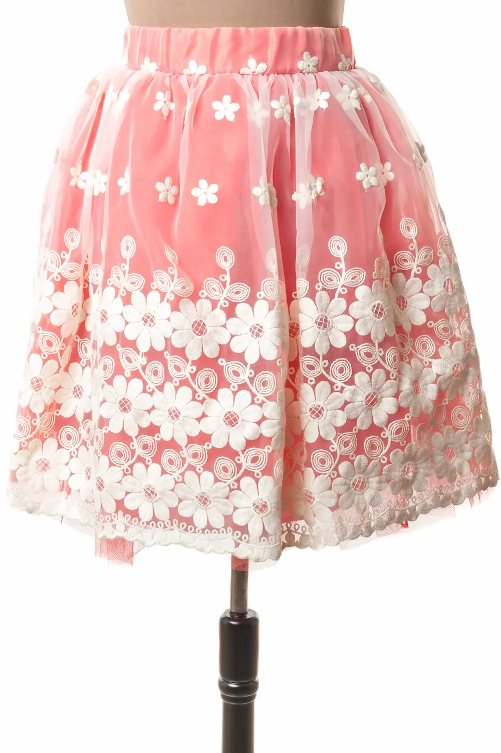 Fusta creata organza cu flori pe fond corai. Tesatura: 100% poliester. Produs fabricat în atelierul #MARUCA.