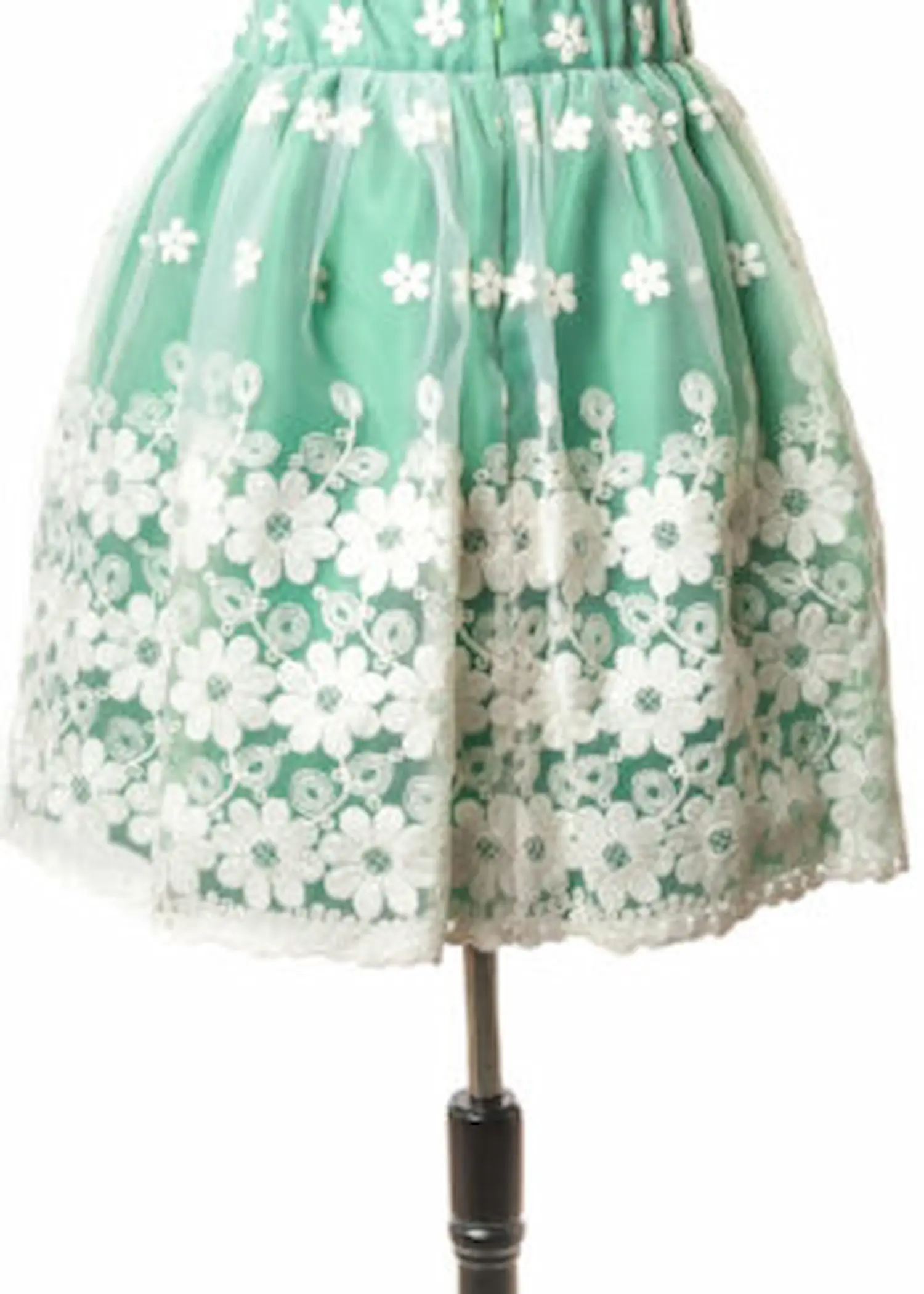 Fusta creata organza cu flori pe fond verde.