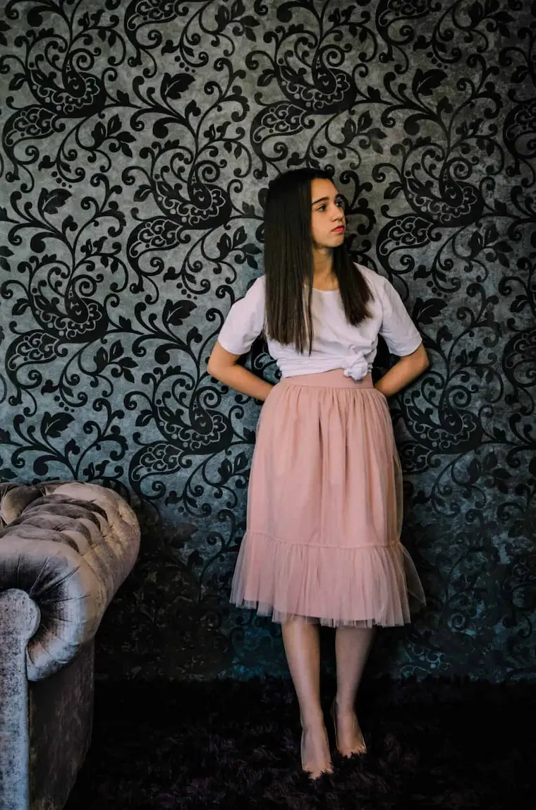 Fusta din tul roz pudra cu volan la poale. O fusta in tendinte si foarte versatila.