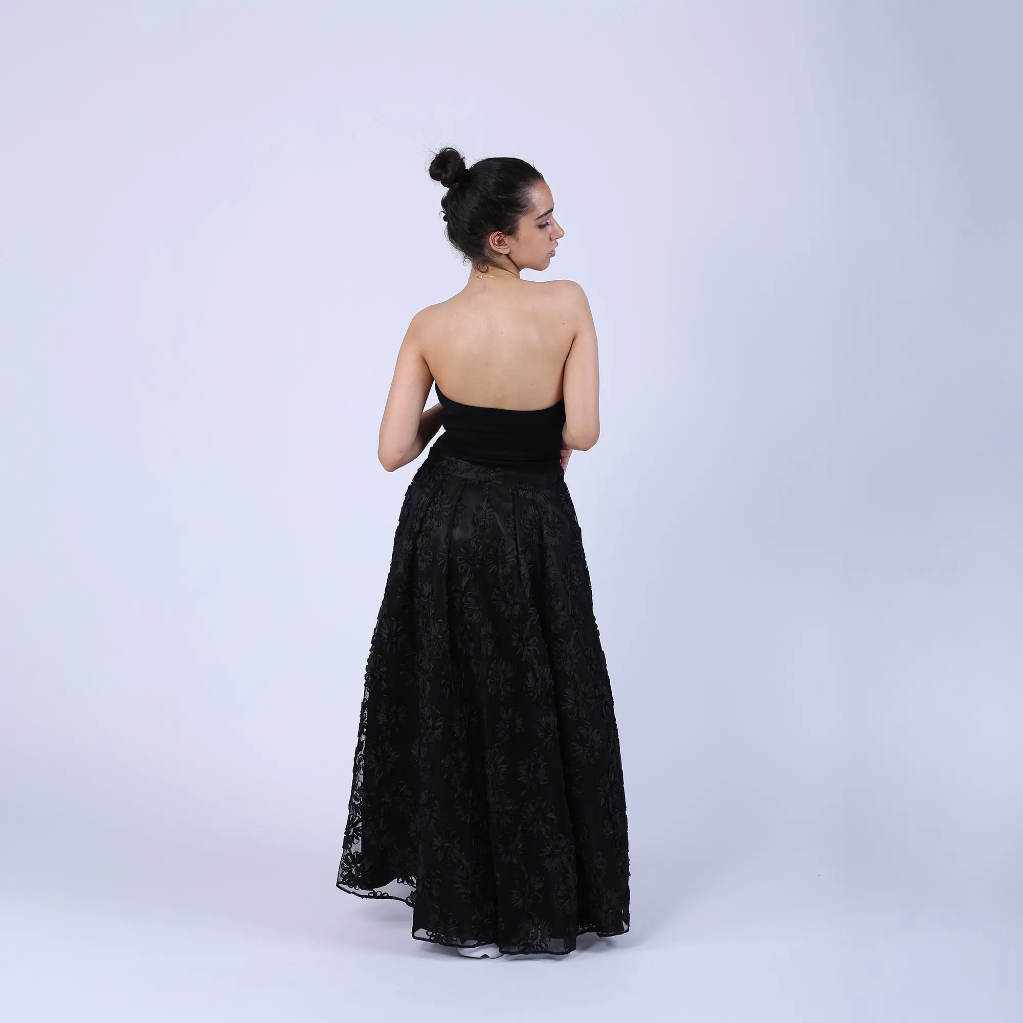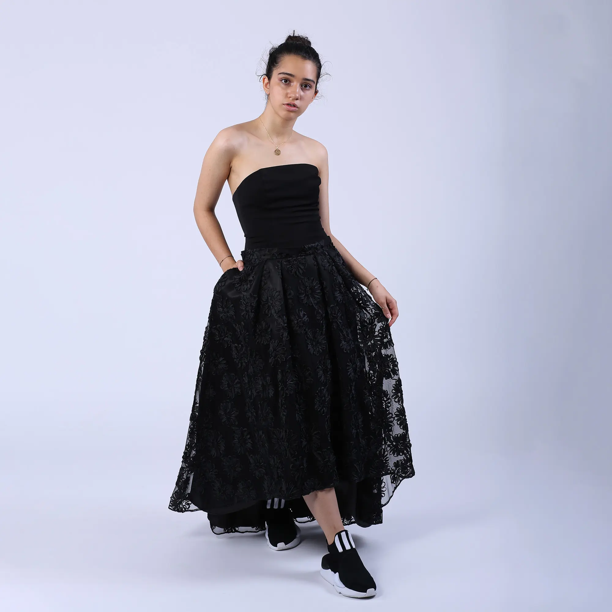 Fusta lunga asimetrica din dantela neagra, cu buzunare si fermoar ascuns. O piesa versatila ce poate fi purtata atat cu sandale cat si cu pantofi sport.