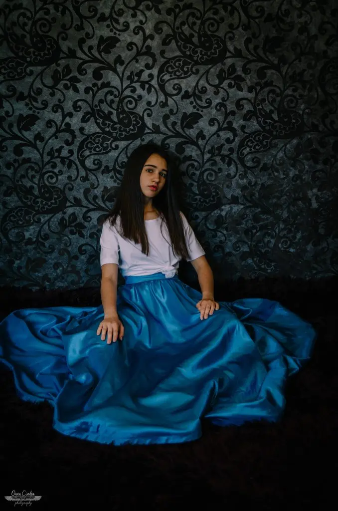 Fusta lunga, de seara, clos din tafta albastru-turcoaz. Tesatura: 100% poliester.