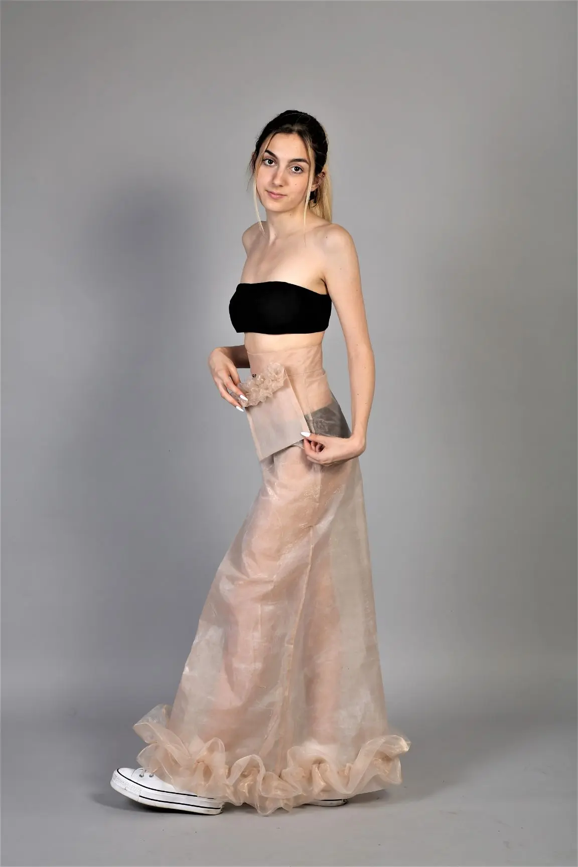 Fusta lunga evazata cu volan la poale si buzunar detasabil. Fusta este confectionata dintr-un material obținut experimental, fiind creat prin lipirea intre ele a 2 foi de organza cu termocolant dublu adeziv, rezultând, astfel, o textură cu farmec și caracter.