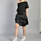 Fusta scurta, petrecuta, accesorizata cu un buzunar lateral. Fusta este confectionata dintr-o tesatura ce combina inul cu matasea si are un aspect fin, putin lucios.