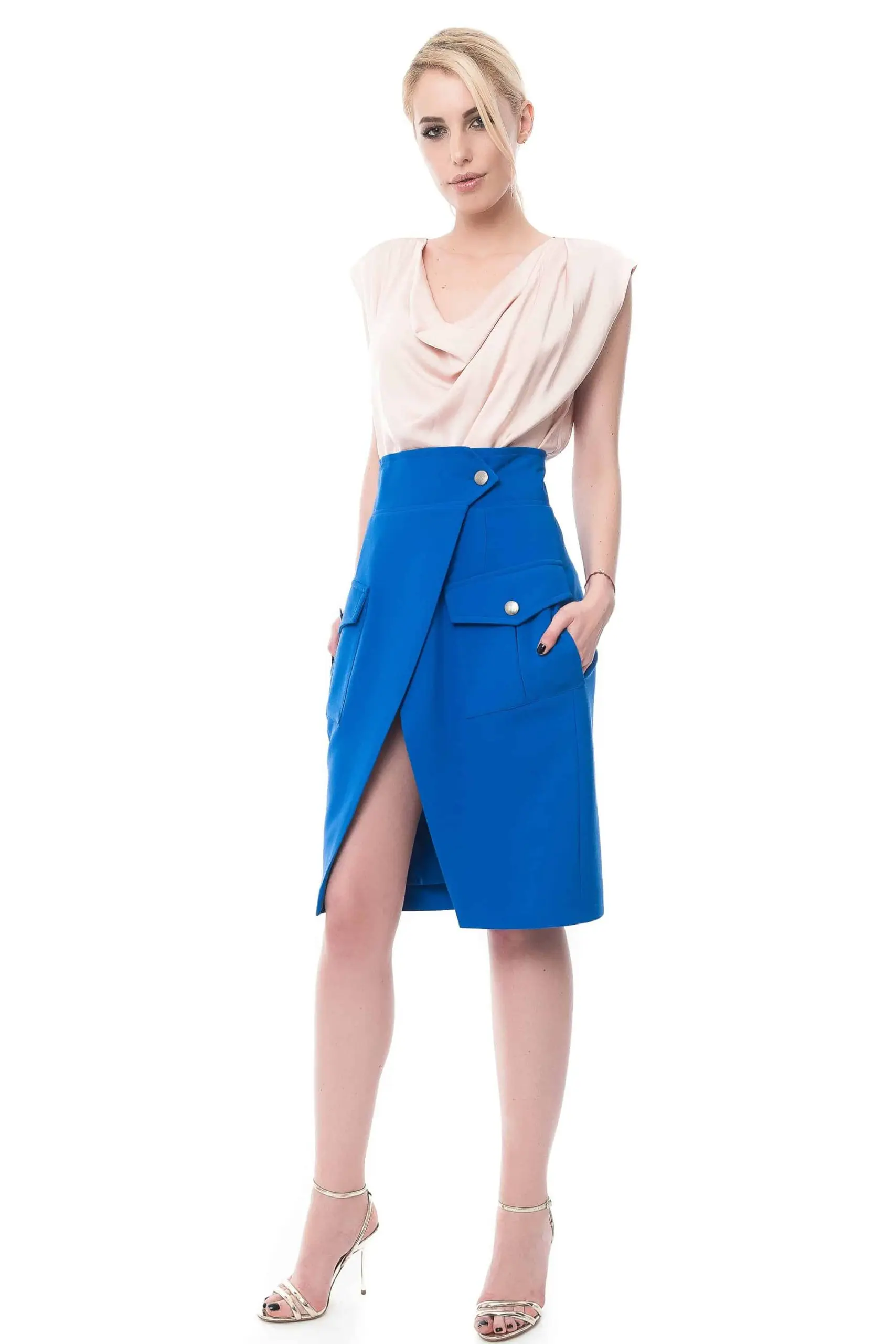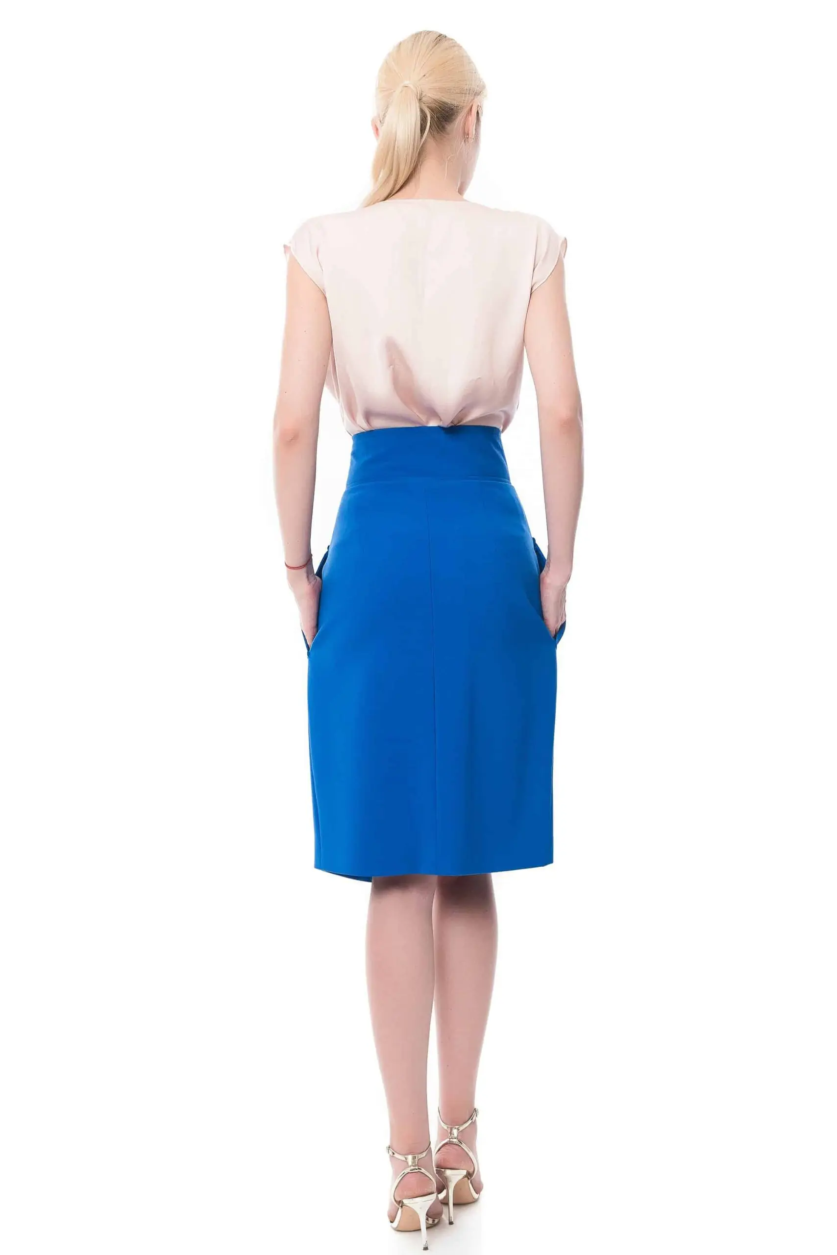 Fusta petrecuta din stofa albastra, cu buzunare aplicate. Fusta are o betelie late care pune talia in evidenta.  Tesatura: 100%poliester. Produs fabricat în atelierul #MARUCA.