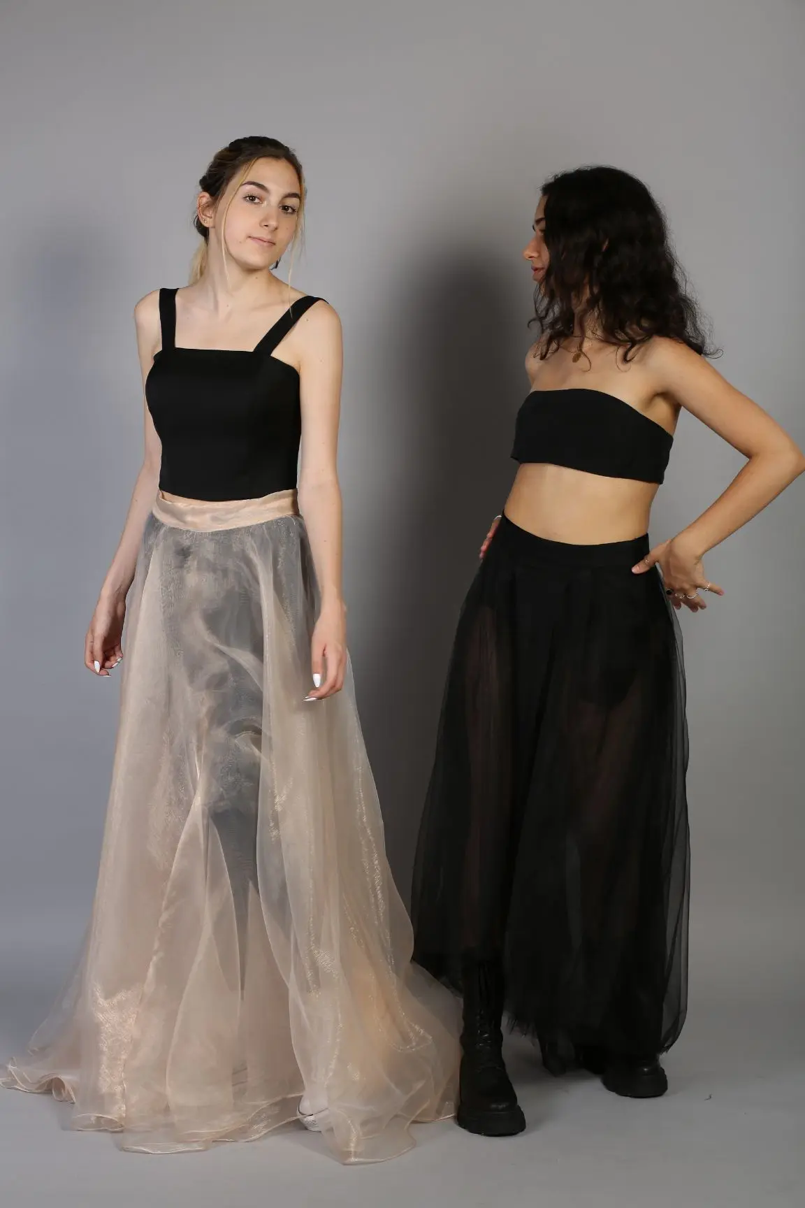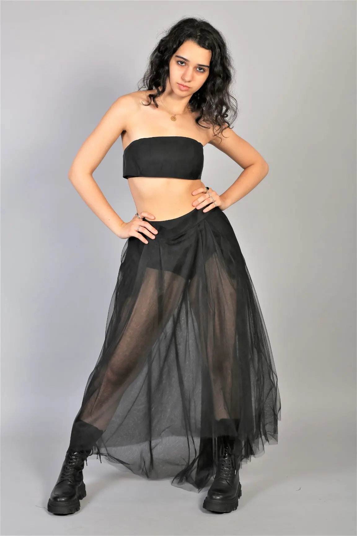Fusta neagra transparenta din tulle. Fusta este asimetrica si are buzunare. O piesa moderna si foarte chic. Poate fi purtata cu topul din matase naturala.