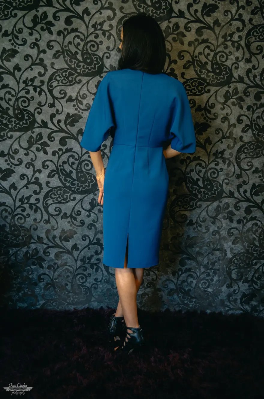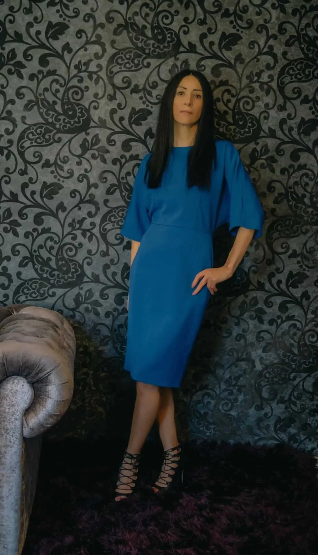 Rochie albastra scurta, dreapta, maneci fluture, evidentiaza frumos talia. Tesatura: 100% vascoza.