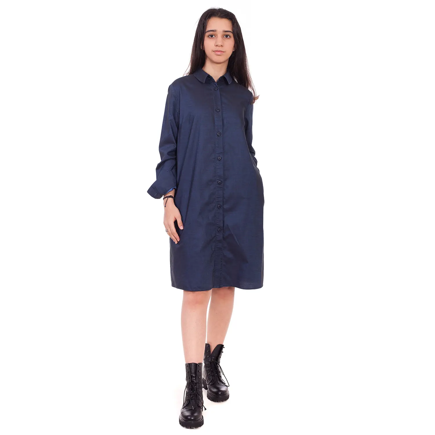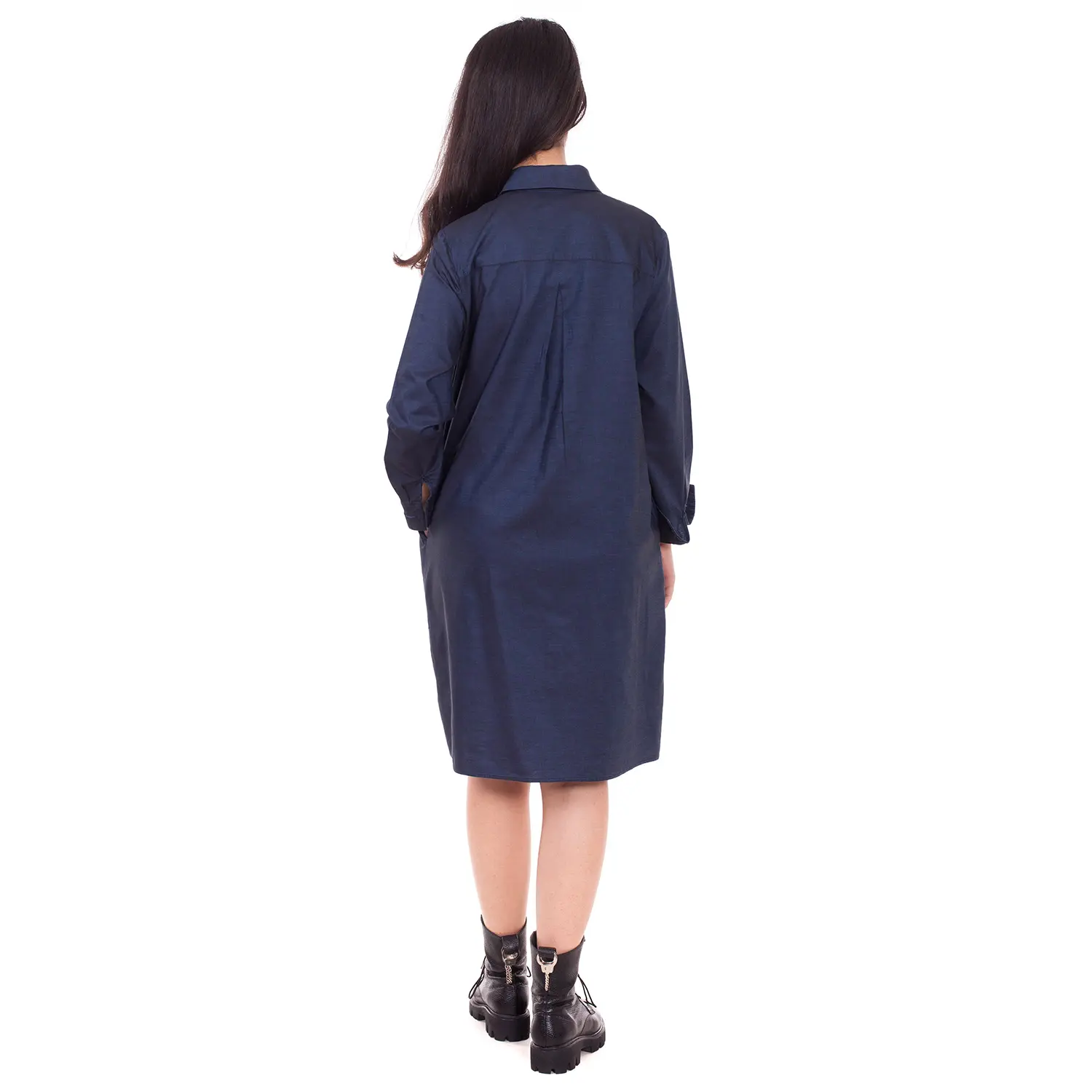 Rochie camasa din bumbac bleumarin cu buzunare laterale. O piesa foarte usor de purtat, atat cu balerini cat si cu pantofi sport.