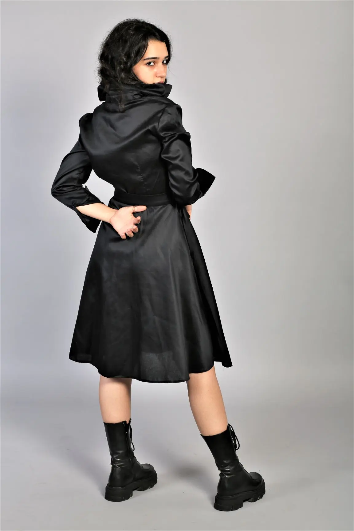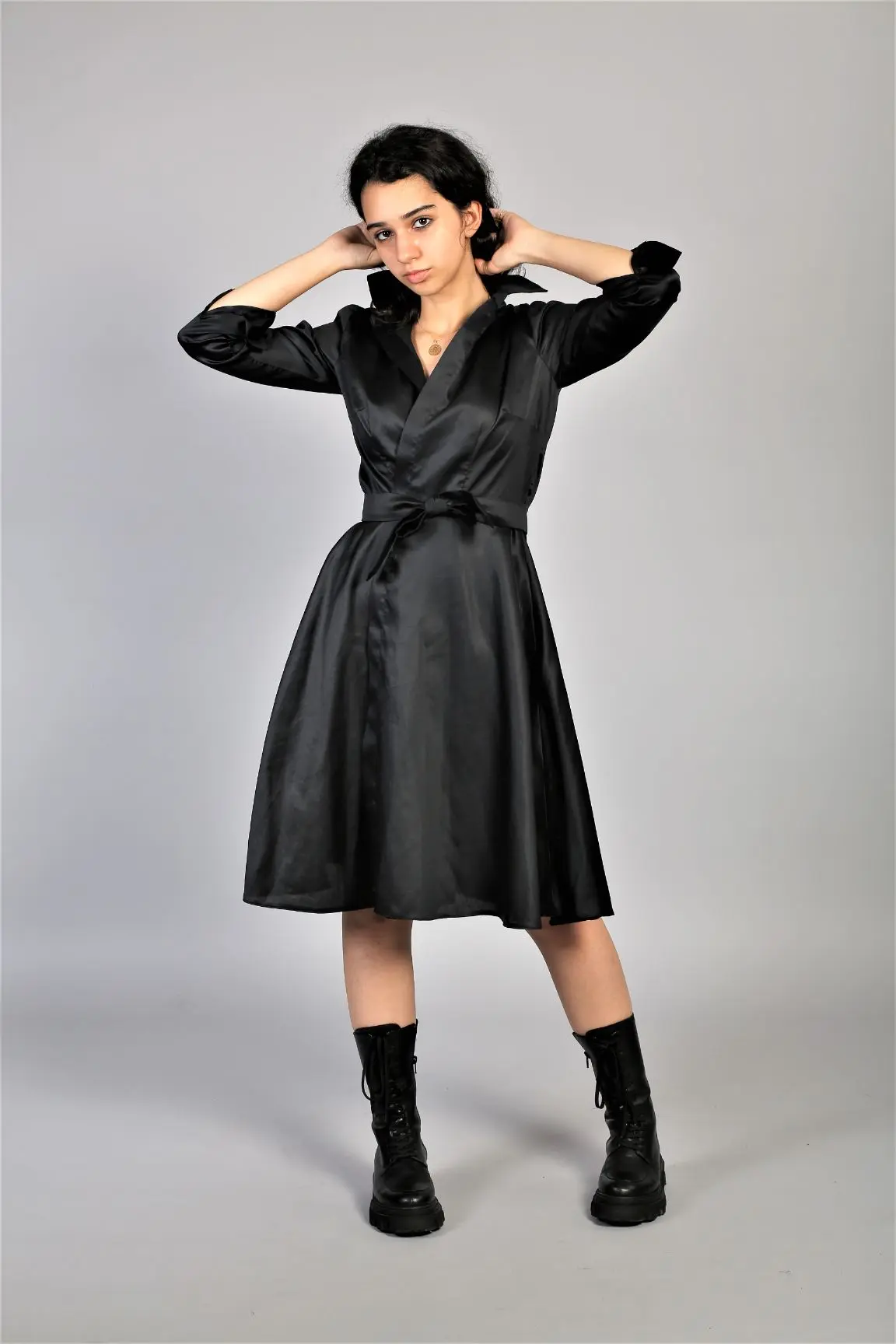Rochie tip camasa, neagra, cu buzunare laterale. Combinatia de in cu matase aduce un luciu tesaturii, care adauga un plus de feminitate si eleganta.