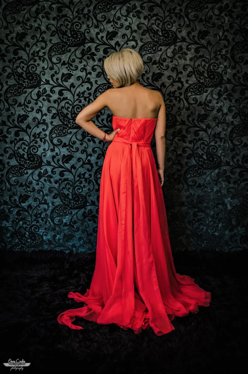 Rochie corai de seara lunga cu bustul drapat si cordon in talie. Tesatura: 100% poliester.