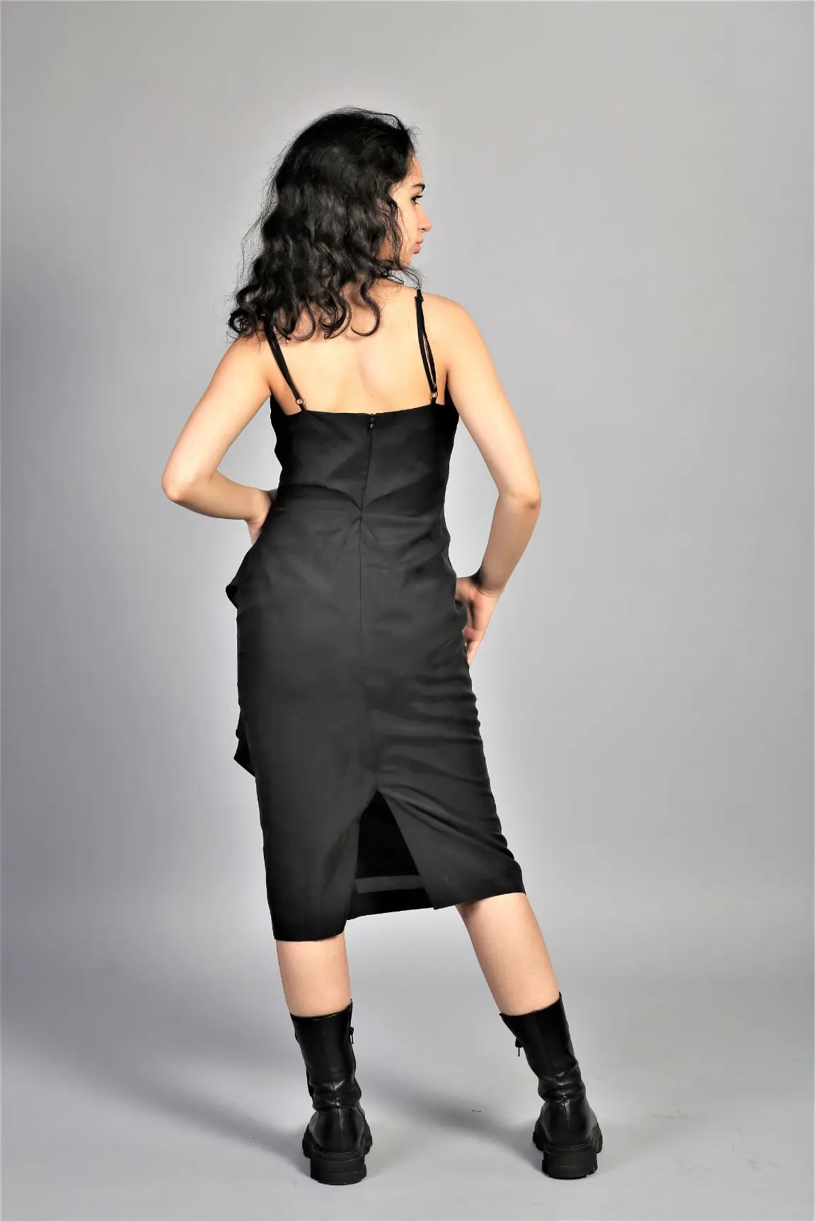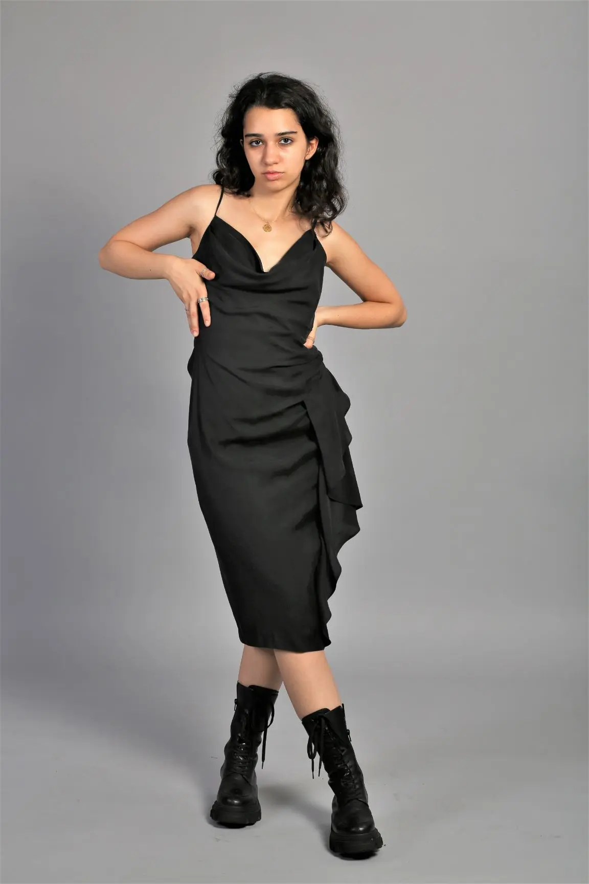 Rochie cu bretele si fronseuri laterale, din matase naturala. Rochia este accesorizata cu un volan fin, asimetric.