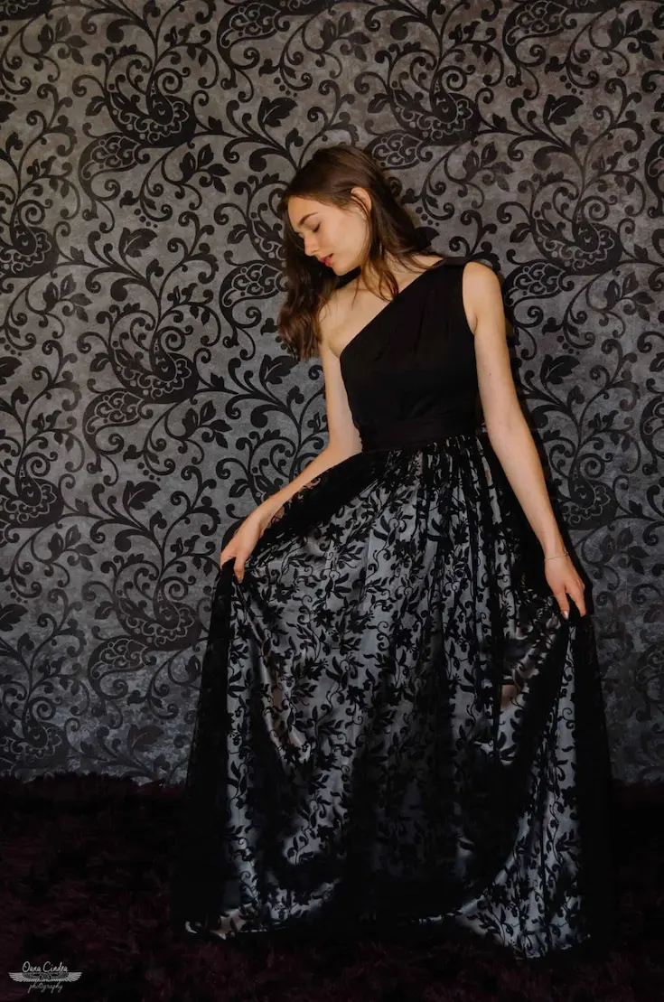 Rochie de seara lunga, pe un umar, din mesh negru cu flori catifelate si bust din matase naturala. Tesatura: Bust – 100% matase naturala, fusta – 100% poliester.