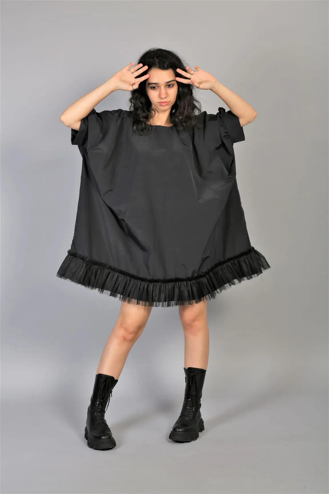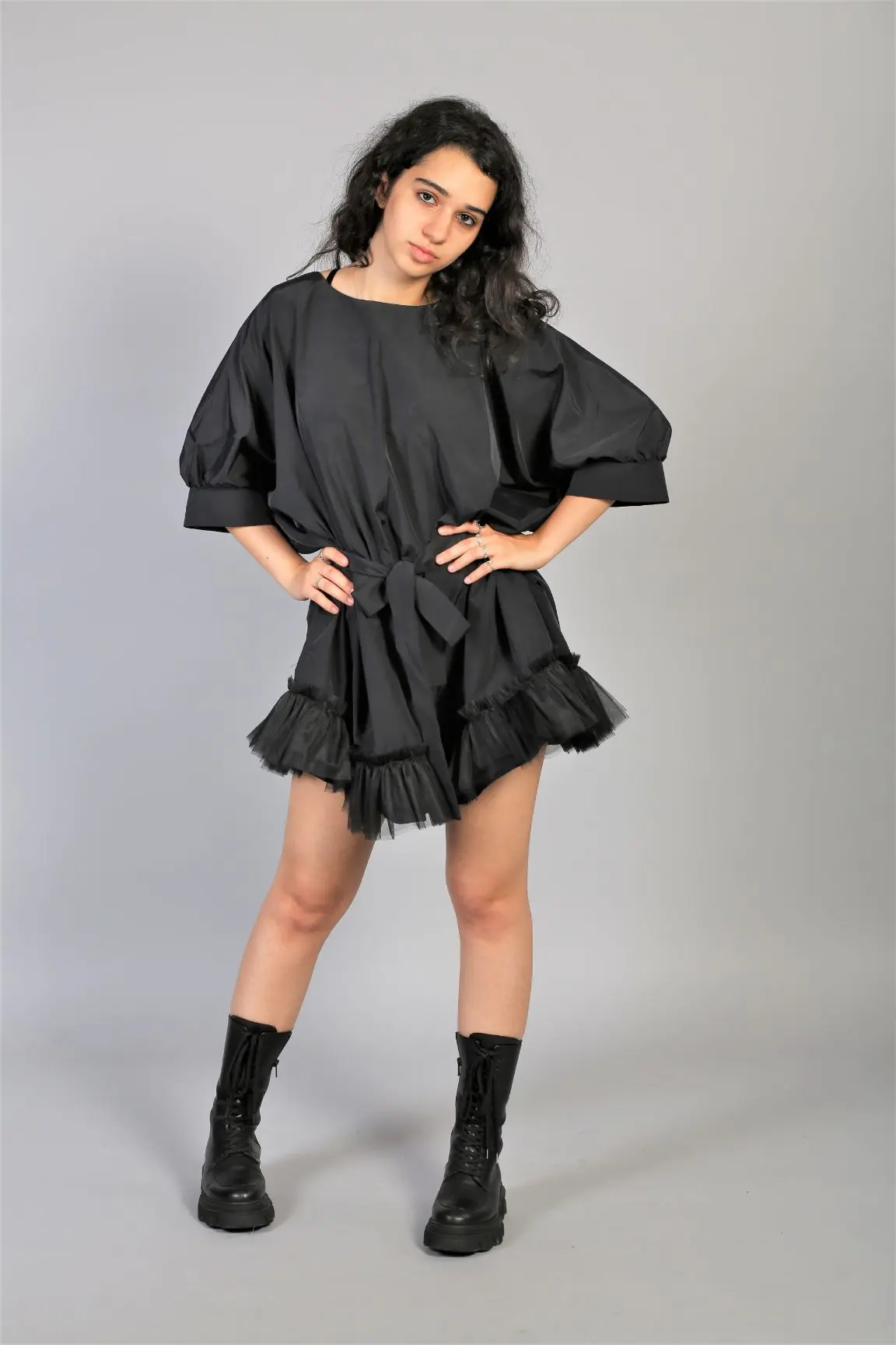 Rochie din fas negru cu volane din tulle, o varianta chic pentru zilele ploioase.