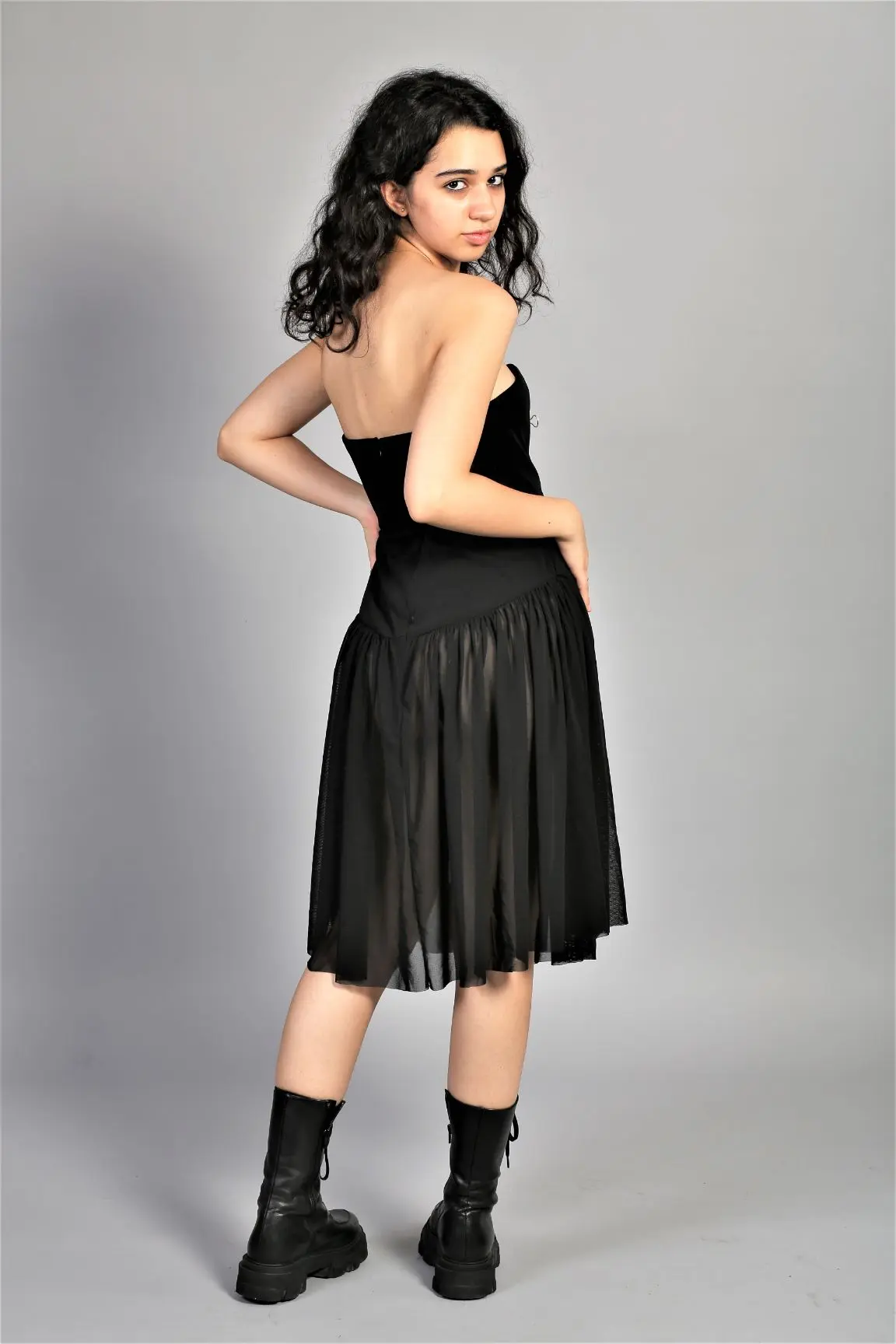 Rochie din mesh negru cu decolteu sub forma de inima, cu poala pe rotund, frumos încrețită.