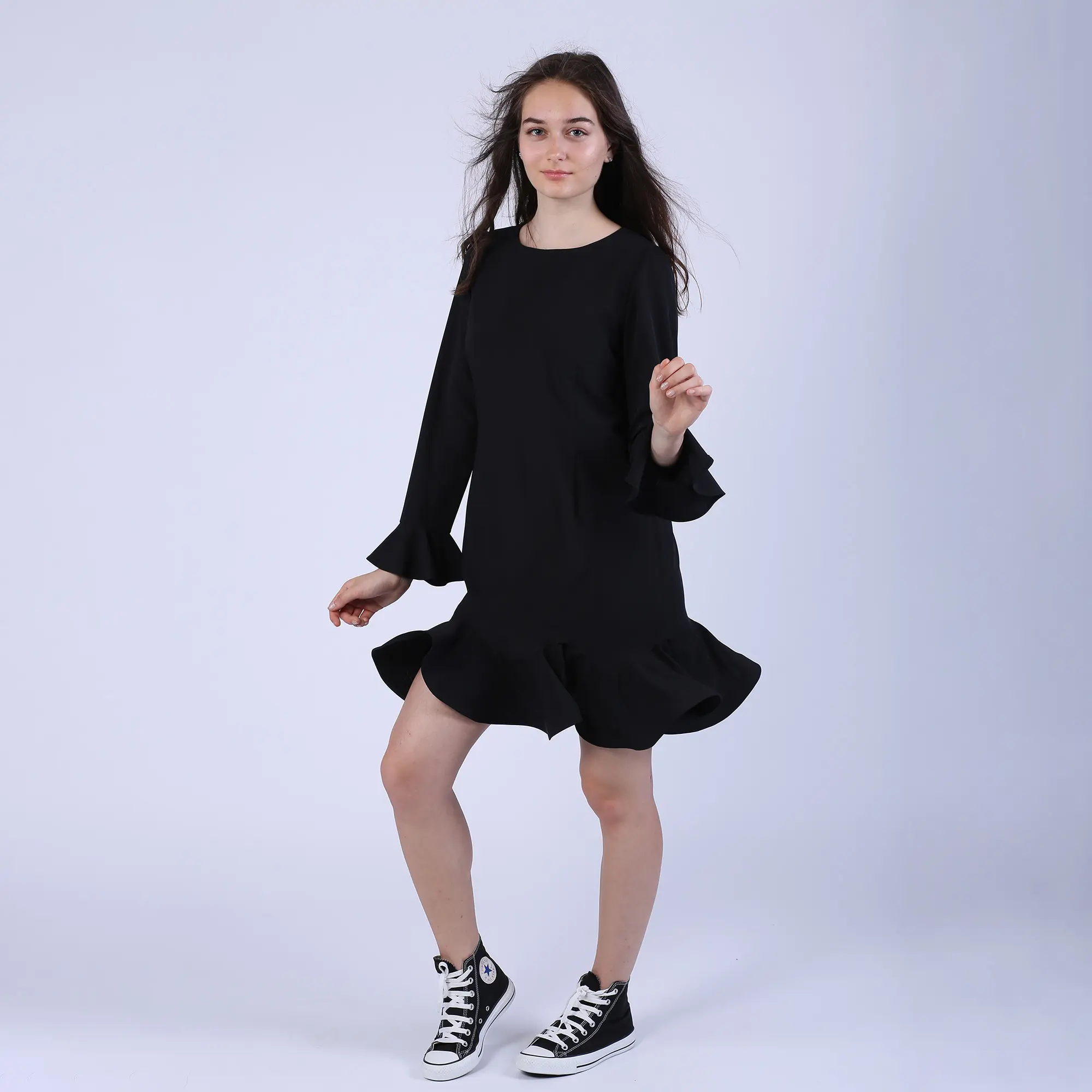 Rochie neagra cu volane la maneci si poale. Este alegerea perfecta pentru o seara in oras sau pentru o petrecere. Intretinere: spalare manuala Tesatura: 100% poliester