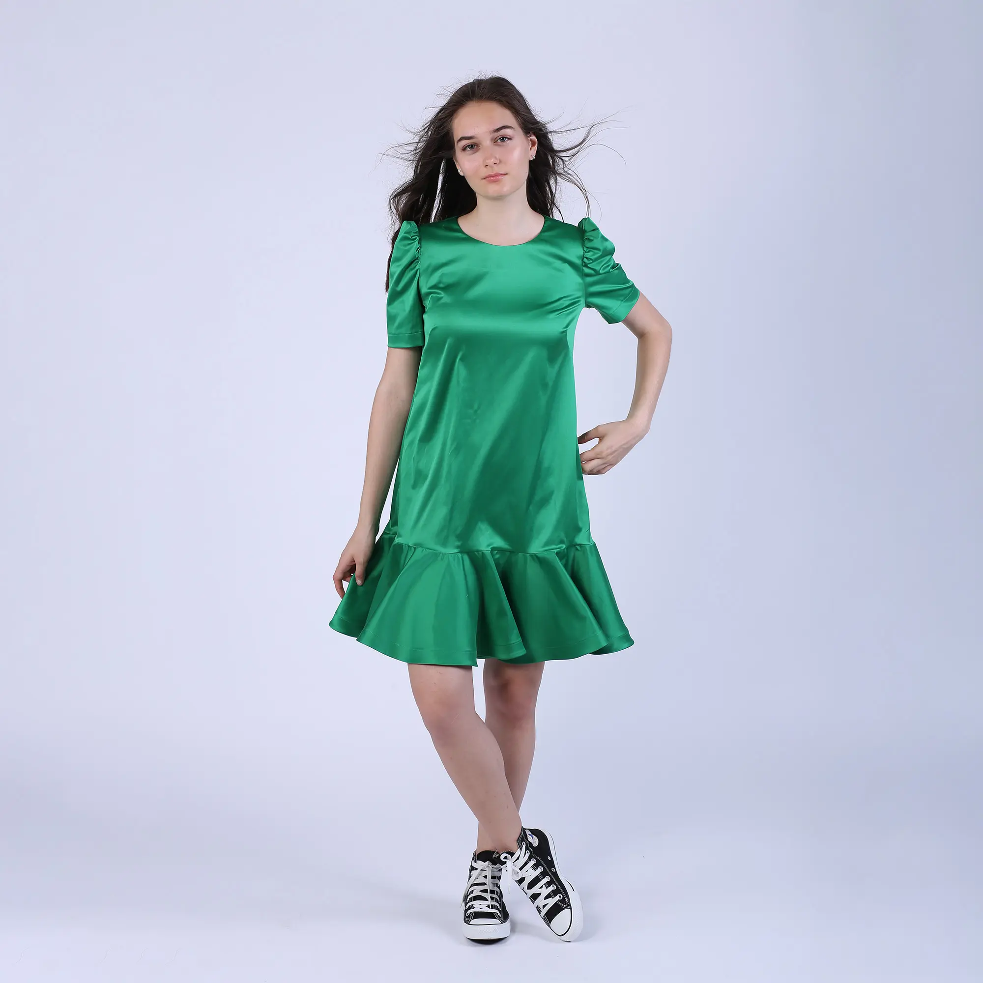 Rochie dreapta din bumbac verde cu volan si maneci bufante