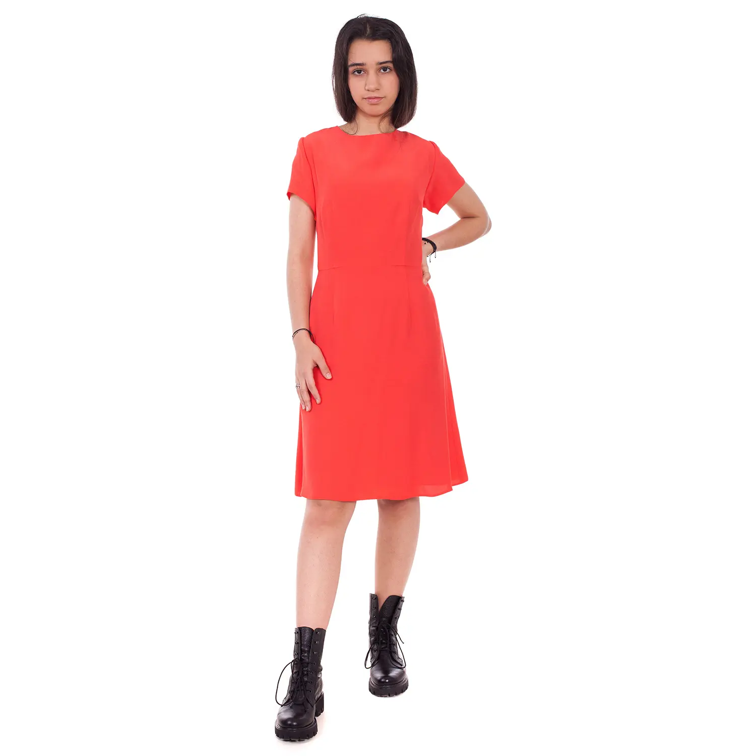 Rochie evazata cu maneca scurta si decolteu rotund din matase naturala corai, model versatil, ce se poate combina cu usurinta in diverse tinute.
