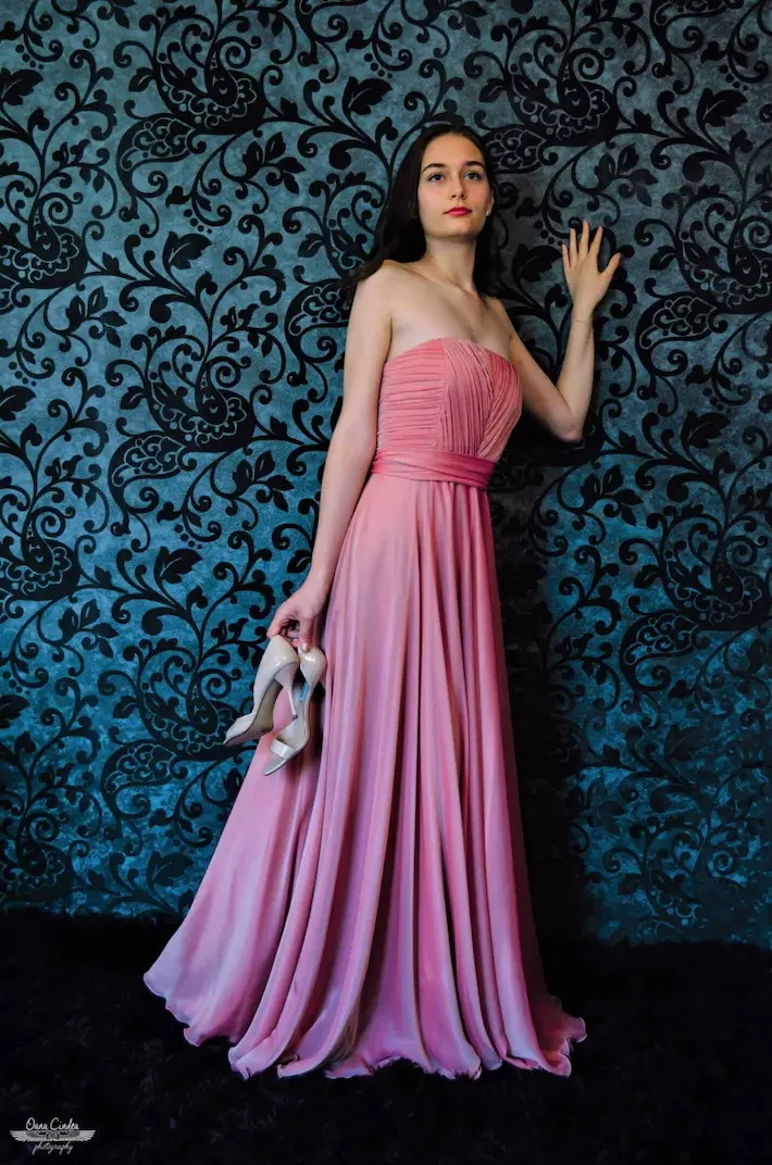 Rochie lunga din voal de matase roz pal cu umerii goi, bustul drapat si fusta clos dublu. Rochie eleganta de seara, foarte vaporoasa. Tesatura: 100% poliester.