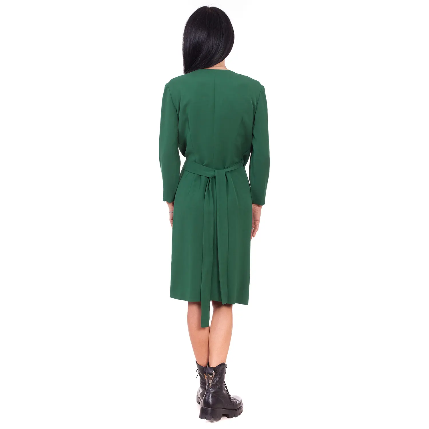 Rochie petrecuta fronsata matase naturala verde inchis. Decolteul in forma literei “V” si fronseurile dispuse in partea din fata ii dau o eleganta romantica. Rochia se poate realiza pe comanda si pe alte culori.