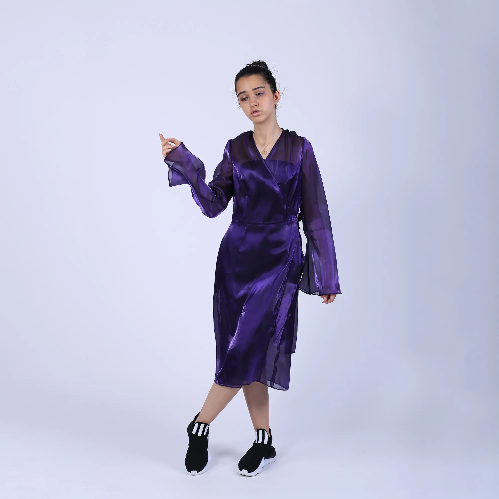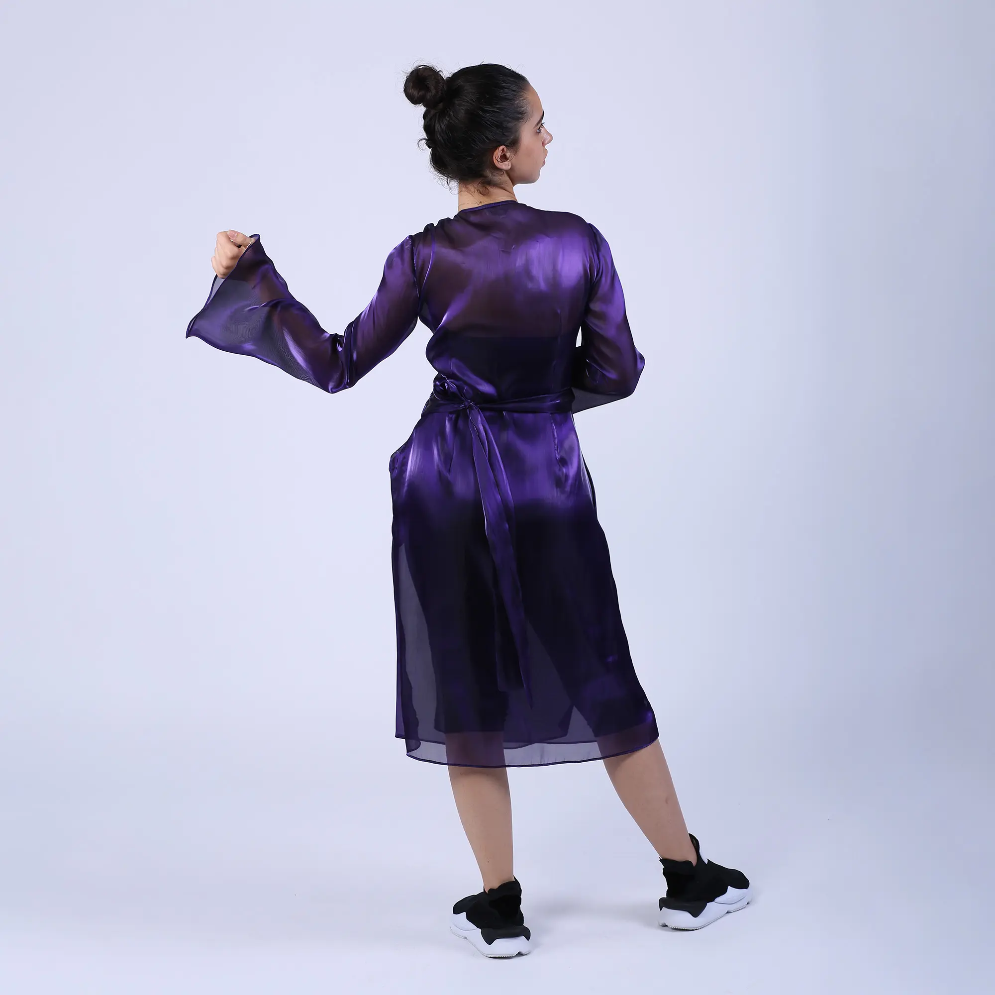 Rochie petrecuta, usor evazata din organza mov. O rochie transparenta care poate fi inclusa intr-o multime de outfit-uri. Intretinere: spalare manuala. Tesatura: 100% poliester