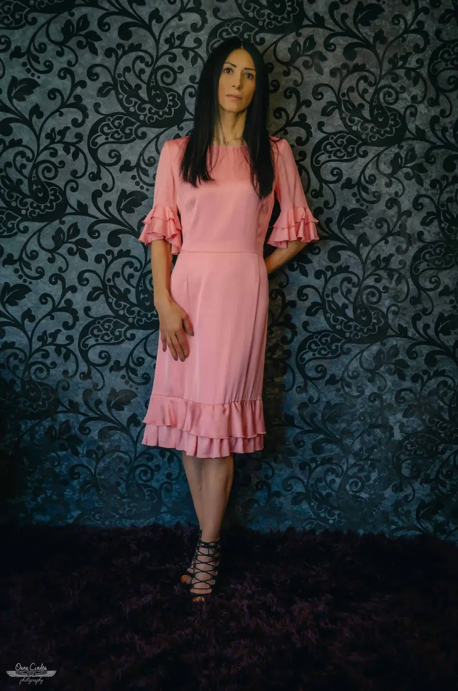 Rochie scurta din matase naturala roz pal cu volane la maneci si poale, foarte eleganta si feminina. Volanele, in partea de jos, creeaza o silueta clepsidra. Tesatura: 100% matase naturala.