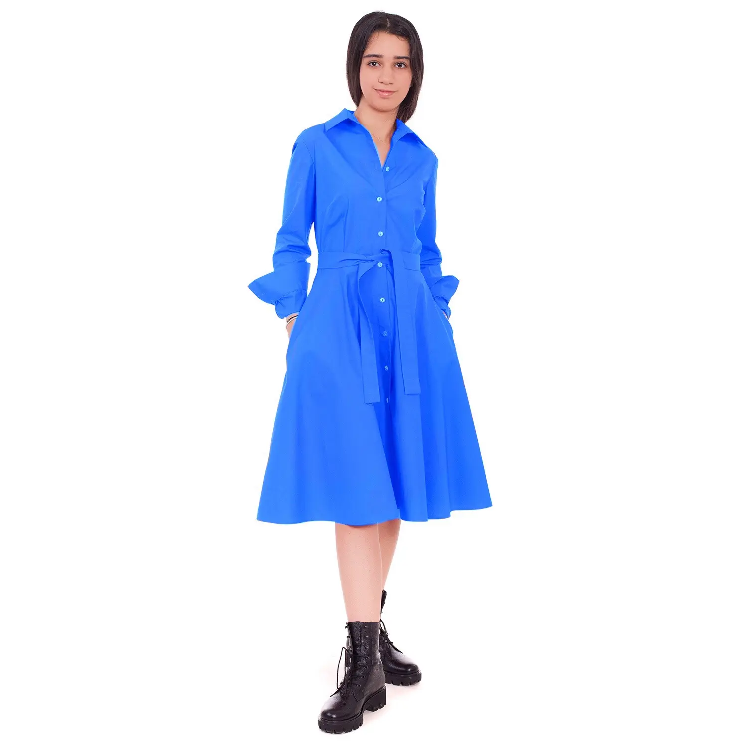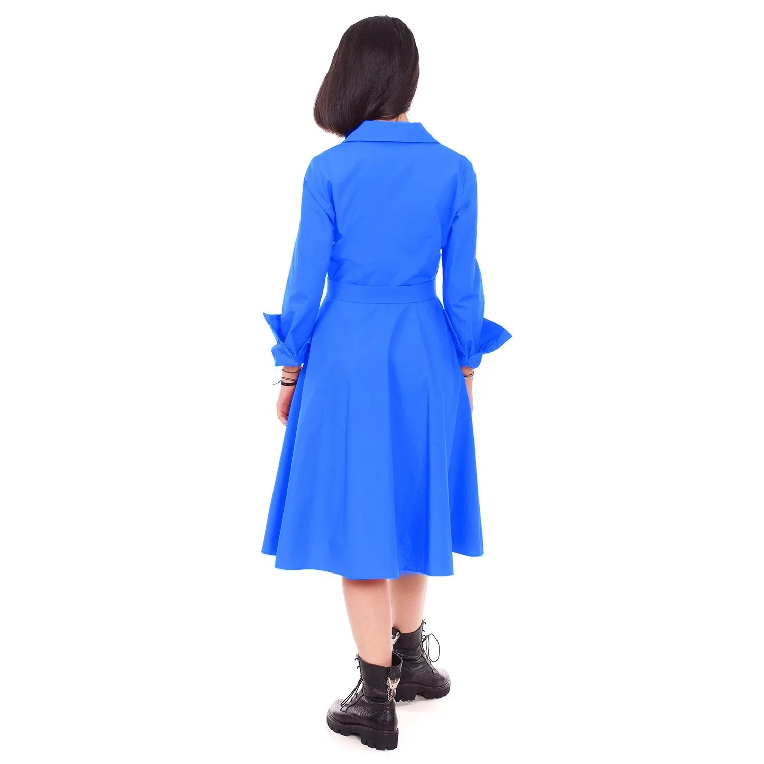Rochie tip camasa, clos din bumbac albastru. O piesa comoda si eleganta, accesorizata cu un cordon care iti evidentiaza talia.