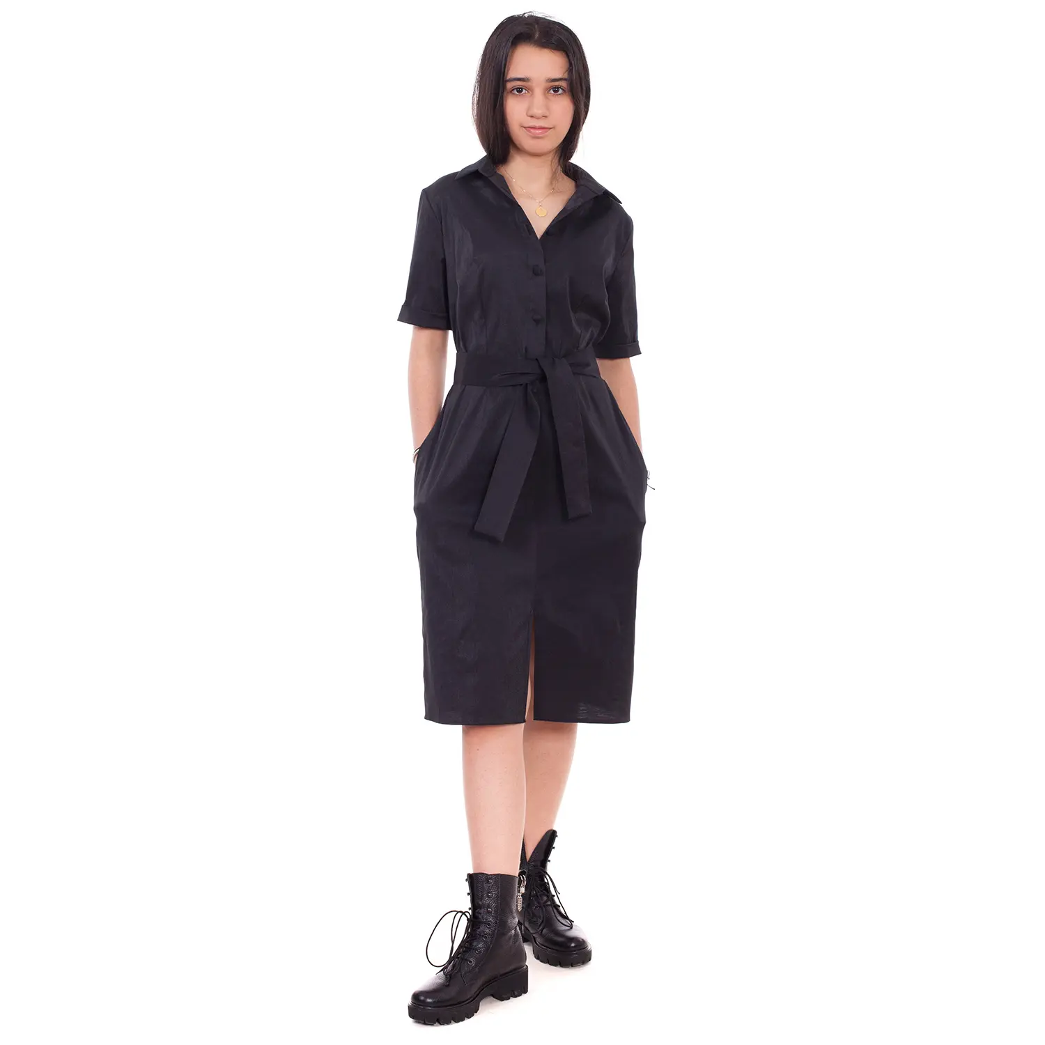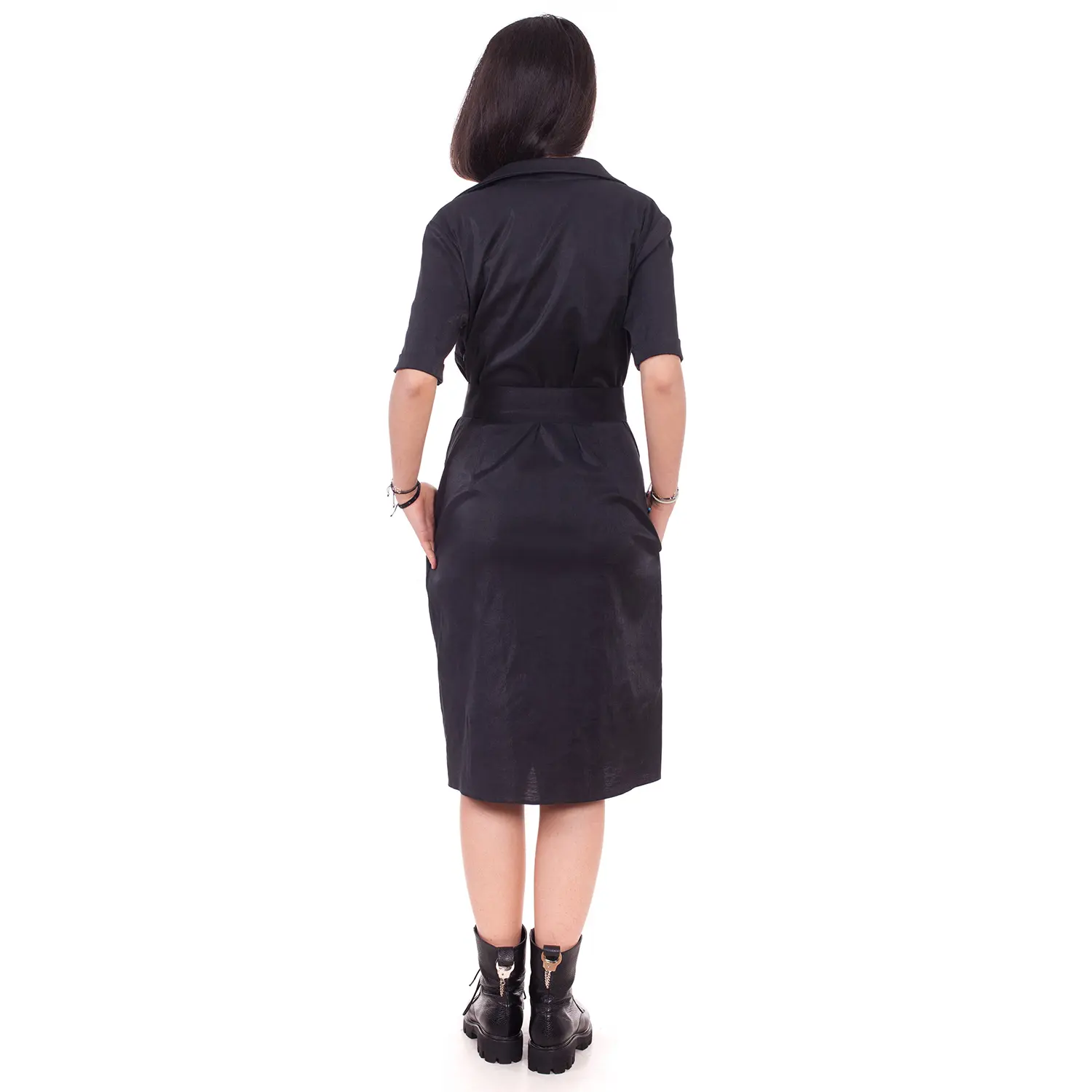 Rochie tip camasa, dreapta din bumbac negru cu buzunare